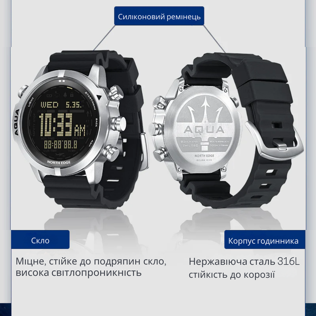 NORTH EDGE AQUA WHITE - це більше, ніж годинник. Це ваш надійний супутник у кожному зануренні та поході, який не тільки стежить за вашою активністю, а й забезпечує вашу безпеку, надаючи найважливішу інформацію прямо на вашому зап'ясті.