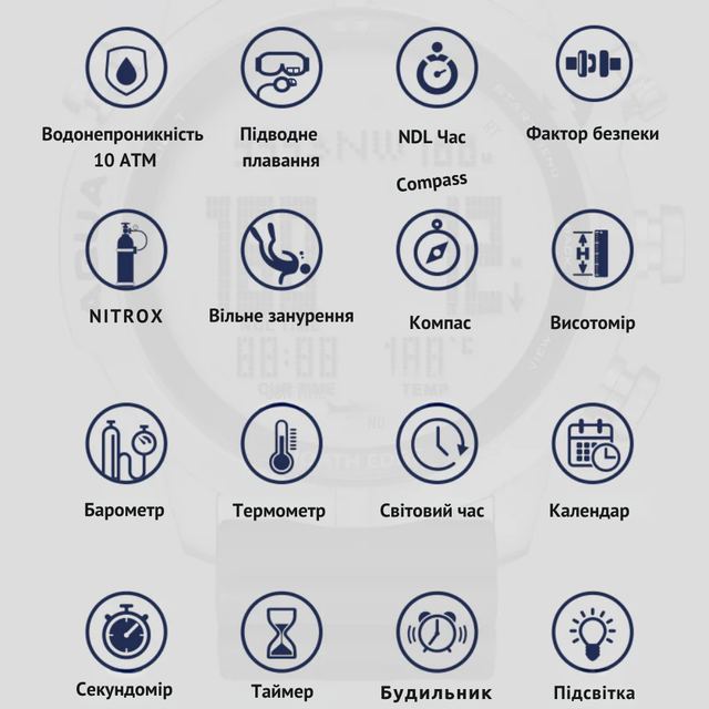 - Відстеження часу без декомпресії (NDL), що допомагає уникнути ризику декомпресійної хвороби.